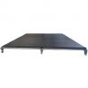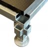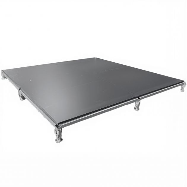 La structure repose sur un châssis en acier galvanisé assurant une résistance adaptée aux contraintes d’utilisation répétée. Le plancher est constitué de panneaux en contreplaqué marin de 24 mm d’épaisseur, composés de 17 plis et recouverts d’un film antidérapant, garantissant une adhérence fiable même en cas de forte fréquentation. Le système modulaire basé sur des éléments de 1,22 x 1,22 m permet de configurer différentes surfaces allant de 13,40 m² à 95,26 m² selon les besoins. La hauteur est réglable de 145 mm à 205 mm, offrant une adaptation aux contraintes du terrain.
