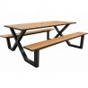 Le plateau et les assises sont réalisés en compact HPL aspect chêne clair, un matériau particulièrement adapté aux environnements extérieurs soumis à une fréquentation régulière. Sa structure dense garantit une bonne résistance mécanique face aux charges réparties et aux sollicitations répétées. Le HPL conserve ses propriétés dimensionnelles dans le temps et supporte les nettoyages fréquents, ce qui en fait un choix cohérent pour une exploitation collective en extérieur.