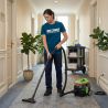 La conception compacte avec des dimensions de 320 x 255 x 325 mm et un poids de 3,9 kg facilite les déplacements fréquents et les interventions rapides dans les espaces encombrés. La cuve d’une capacité totale de 8 litres permet d’enchaîner les opérations de nettoyage sans interruption prolongée. Le faible niveau sonore de 59 dB(A) favorise une utilisation en présence du public ou du personnel sans perturber l’activité environnante. La pédale marche/arrêt au pied améliore l’ergonomie et limite les manipulations répétées de l’interrupteur lors des déplacements.
