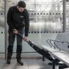 Le profil latéral de moins de 5 cm permet d'atteindre les zones inaccessibles aux autolaveuses classiques : sous-cloisons basses, barres de seuil, pourtours de cuvettes sanitaires. Les bords chanfreinés de la tête traitent les angles sans repasse manuelle. La batterie core-ion amovible 25,2 V – 5 Ah assure une autonomie de 1 h à 1 h 15 avec rechargement à 90 % en 1 heure ; la version double batterie supprime les interruptions sur les chantiers prolongés. Le réservoir d'eau propre (2,5 litres, fixation magnétique) se remplit sous n'importe quel robinet en moins de 20 secondes ; le réservoir de récupération de 2,8 litres se détache et se vide sans outil.